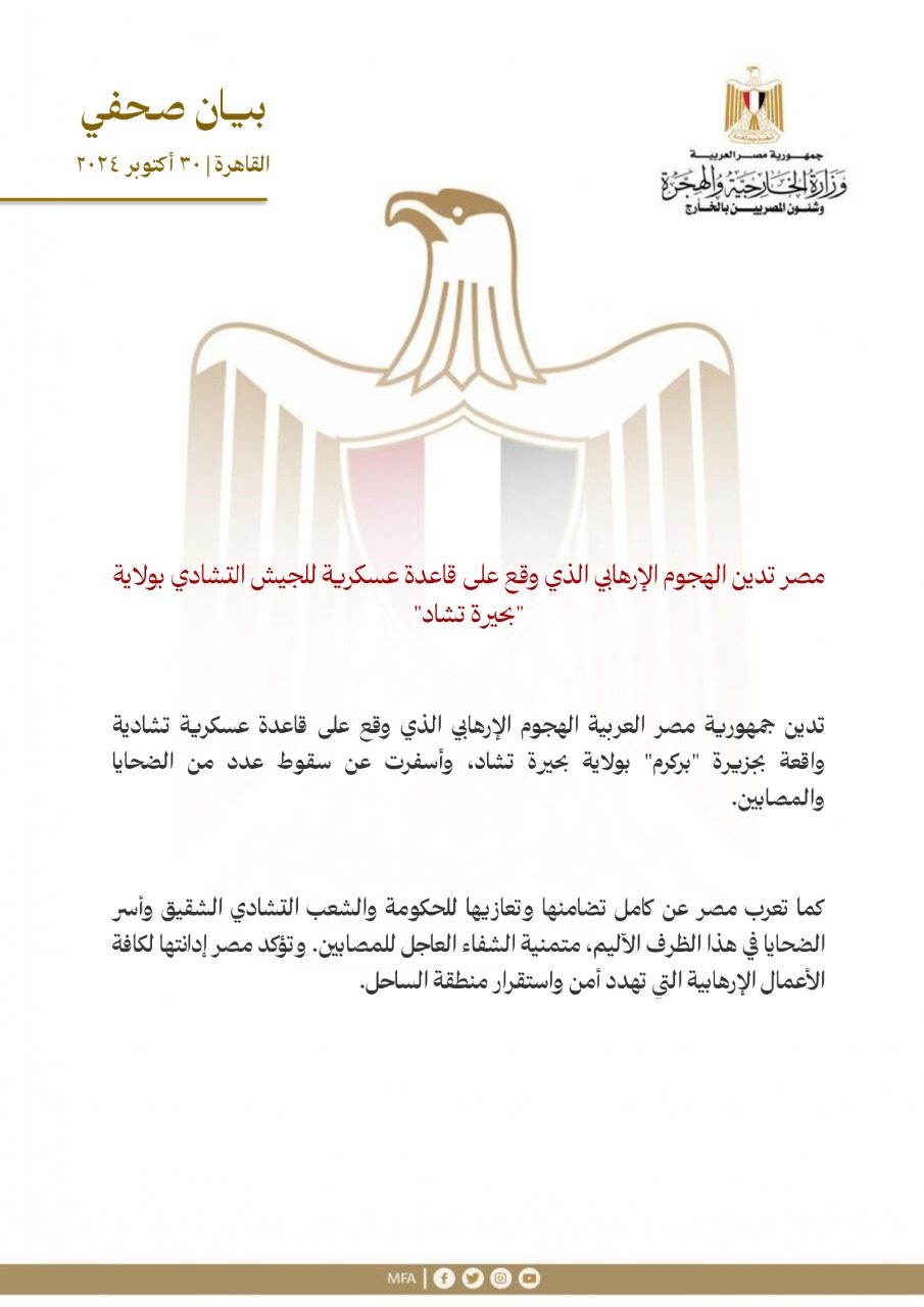كما تعرب مصر عن كامل تضامنها وتعازيها للحكومة والشعب التشادي الشقيق وأسر الضحايا في هذا الظرف الآليم، متمنية الشفاء العاجل للمصابين. وتؤكد مصر إدانتها لكافة الأعمال الإرهابية التي تهدد أمن واستقرار منطقة الساحل.