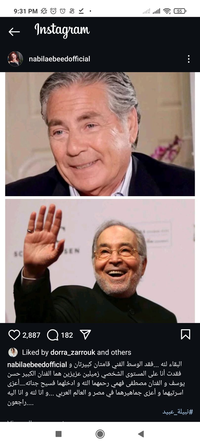 ونشرت صورة لـحسن يوسف ومصطفى فهمى، عبر حسابها الرسمي على موقع تبادل الصور والفيديوهات "إنستجرام" قائلة: "البقاء لله فقد الوسط الفنى قامتين كبيرتين وفقدت أنا على المستوى الشخصى زميلين عزيزين هما الفنان الكبير حسن يوسف والفنان مصطفى فهمى".