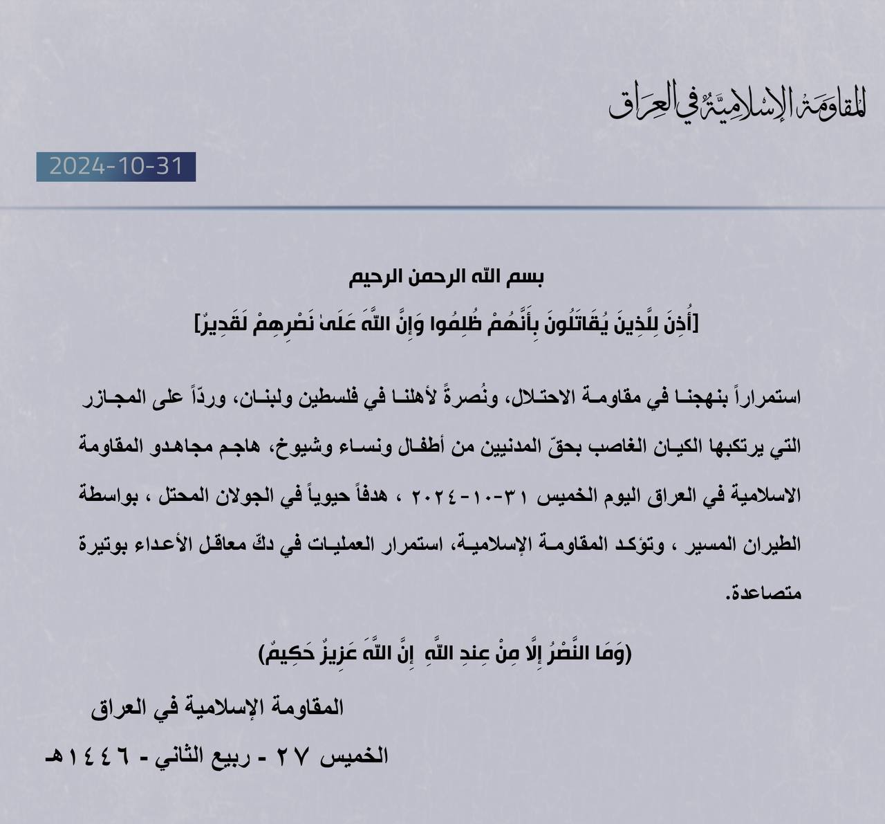 وقالت المقاومة العراقية: استمرارًا بنهجنا في مقاومة الاحتلال، ونُصرةً لأهلنا في فلسطين ولبنان، وردًّا على المجازر التي يرتكبها الكيان الغاصب بحقّ المدنيين من أطفال ونساء وشيوخ، هاجم مجاهدو المقاومة الاسلامية في العراق اليوم الخميس 31-10-2024 ، هدفاً حيوياً في الجولان المحتل، بواسطة الطيران المسير، وتؤكد المقاومة الإسلامية، استمرار العمليات في دكّ معاقل الأعداء بوتيرة متصاعدة.