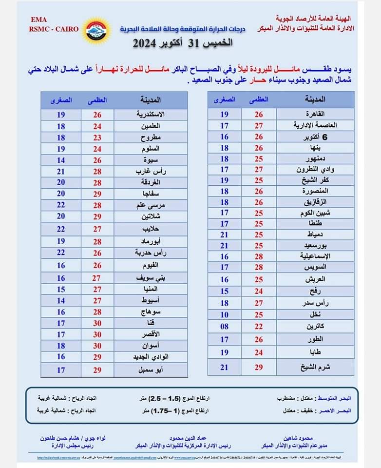 درجات الحرارة وطقس اليوم..يشهد اليوم الخميس الموافق 31 أكتوبر، أولى منخفضات فصل الخريف 2024، حيث يسود حالة من عدم الاستقرار في الأحوال الجوية وتتساقط أمطار خفيفة اليوم على غرب البلاد.