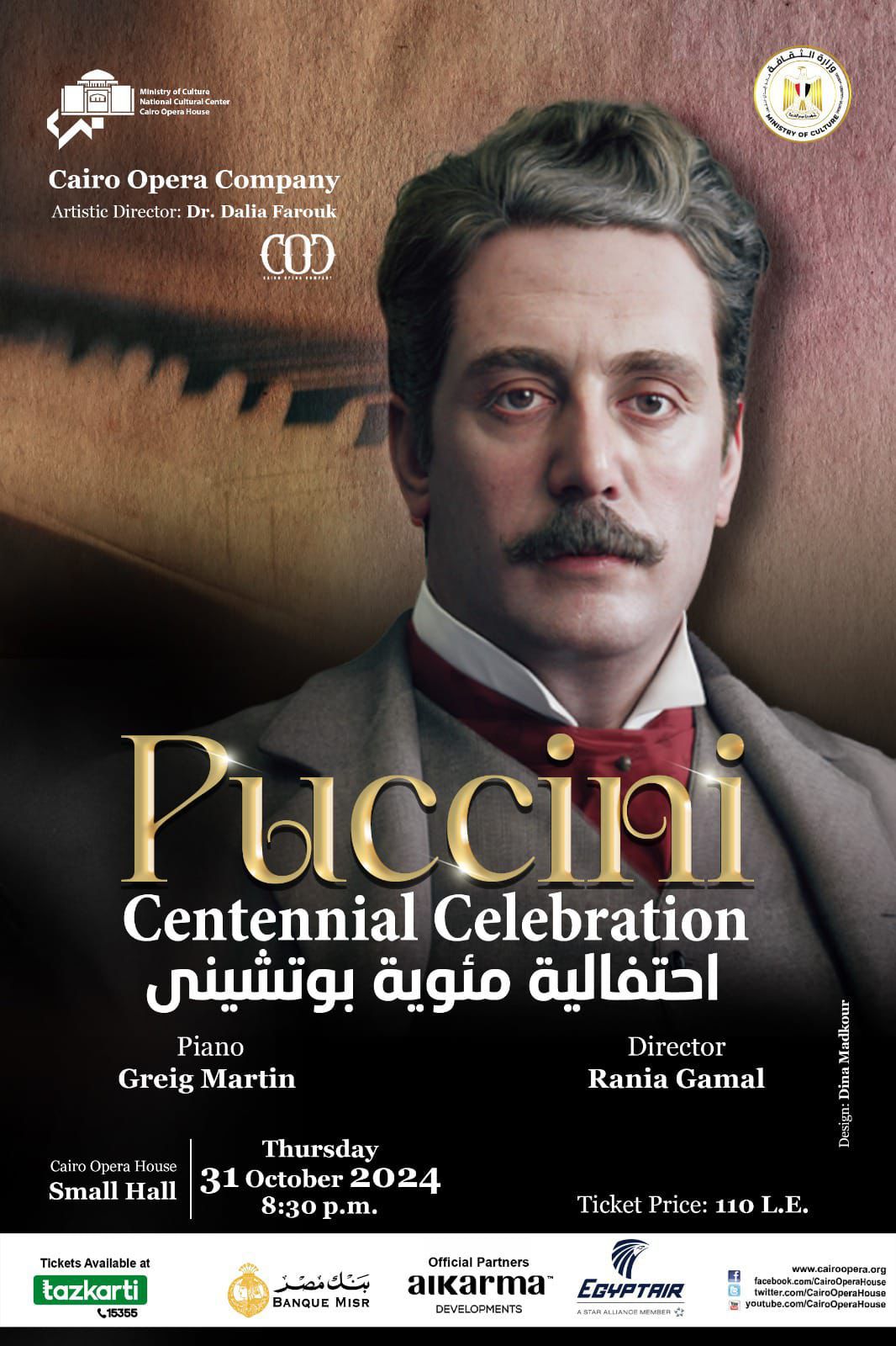 تقيم دار الأوبرا المصرية برئاسة الدكتورة لمياء زايد، احتفالية بمناسبة مئوية المؤلف الموسيقي العالمي بوتشيني، يحييها نجوم فرقة أوبرا القاهرة تحت إشراف المدير الفني الدكتورة داليا فاروق بمصاحبة عازف البيانو جريج مارتن وإخراج رانيا جمال، وذلك في الثامنة والنصف مساء اليوم، الخميس على المسرح الصغير، في إطار فعاليات وزارة الثقافة الهادفة إلى تقديم مختلف ألوان الفنون العالمية.