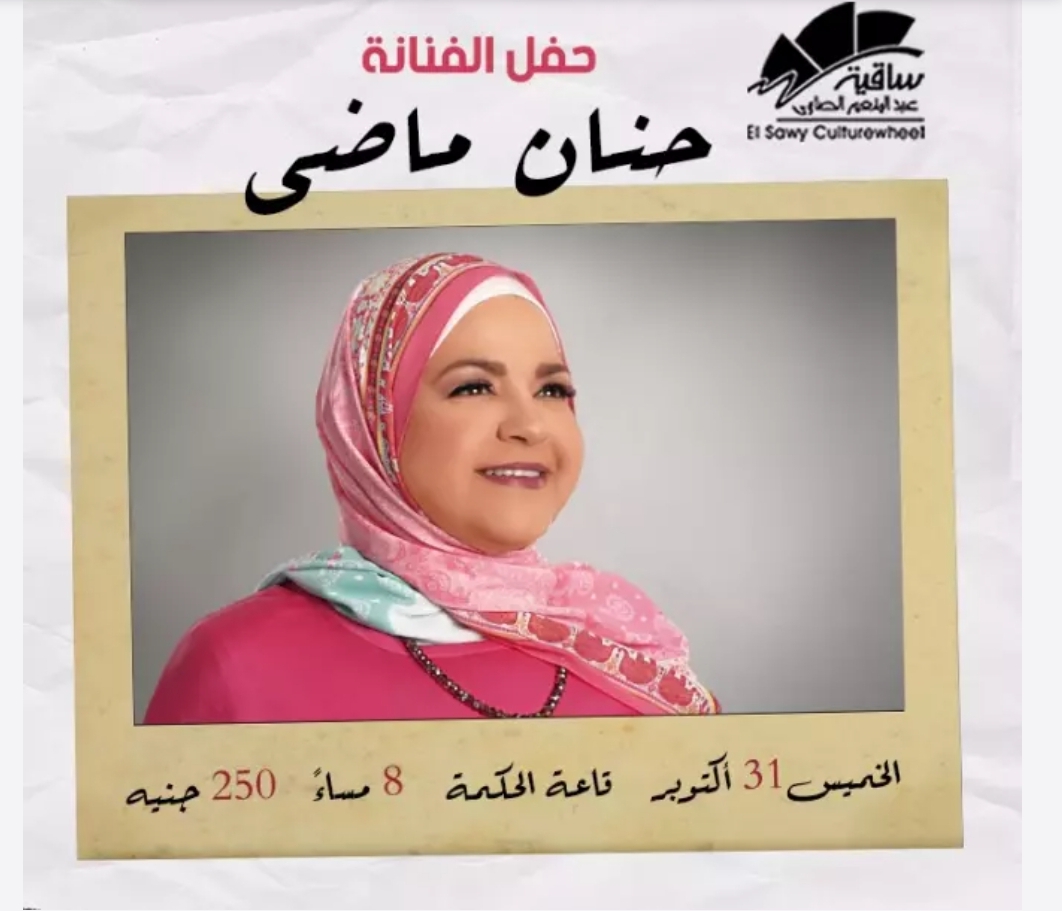 تحيي الفنانة حنان ماضي، حفل غنائي بساقية عبدالمنعم الصاوي، في الثامنة مساء اليوم، الخميس، بقاعة الحكمة وسعر التذكرة ٢٥٠ جنيه.