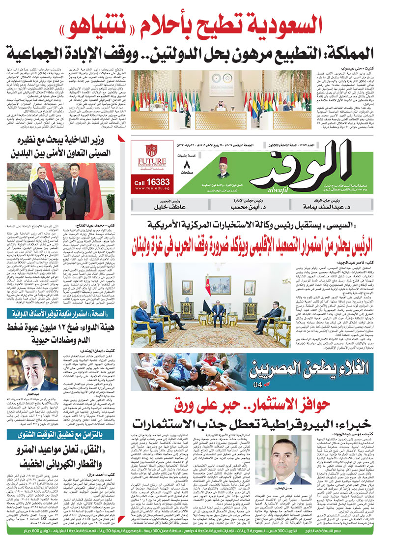 تنشر جريدة الوفد في عددها الصادر، غدًا الجمعة، العديد من الموضوعات والتقارير الإخبارية المهمة، أبرزها: "السعودية تطيح بأحلام نتنياهو".