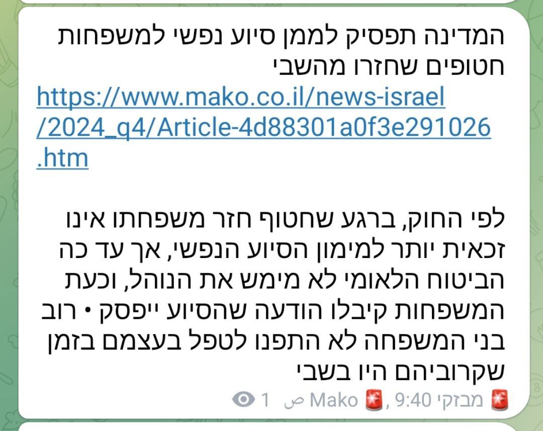 وأضافت الوسائل، أنه بحسب القانون، بمجرد عودة الأسير، لا يحق لعائلته الحصول على تمويل المساعدة النفسية، وتلقت العائلات إشعارًا بوقف المساعدة .