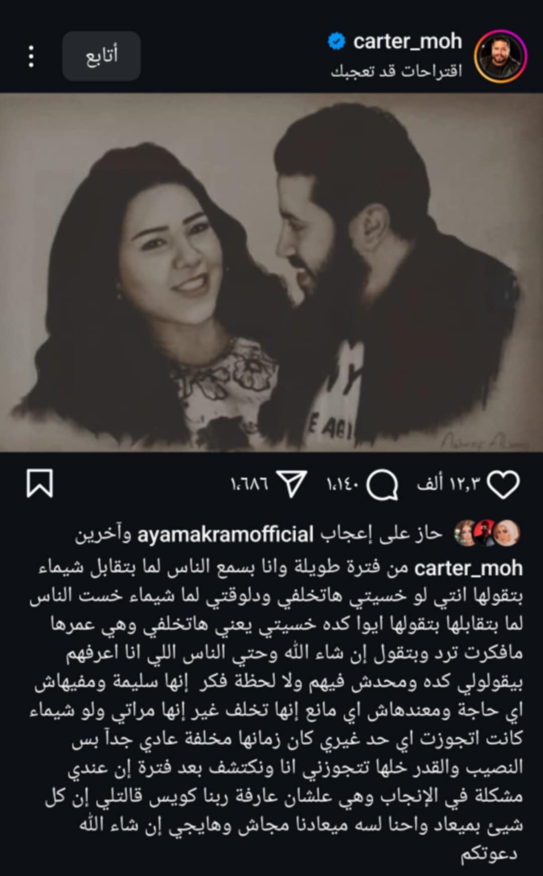 ونشر كارتر، صورة له مع زوجته وعلق عليها قائلًا: "من فترة طويلة وأنا بسمع الناس لما بتقابل شيماء بتقولها انتي لو خسيتي هتخلفي، ودلوقتي لما شيماء خست الناس لما بتقابلها بتقولها أيوة كده خسيتي يعني هتخلفي وهي عمرها ما فكرت ترد وبتقول إن شاء الله".