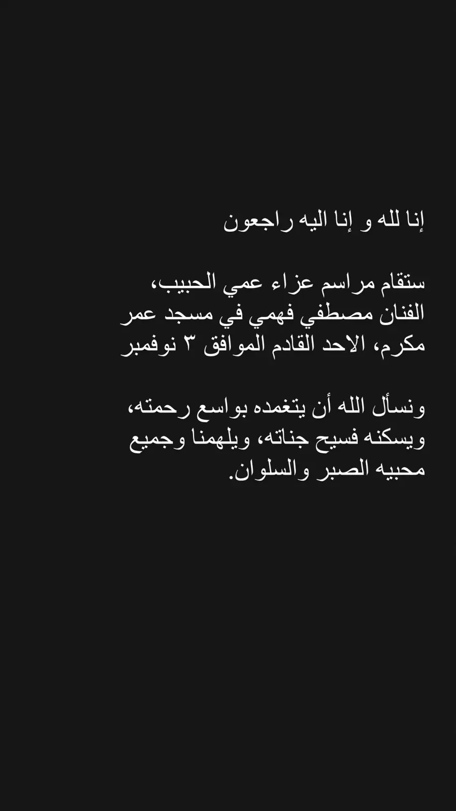 شاركت “منة حسين فهمي” المتابعين على موعد مراسم العزاء،عبر حسابها قائلة:" ستقام مراسم عزاء عمي الحبيب الفنان مصطفى فهمي في مسجد عمر مكرم،/ الأحد القادم المرافق 3 نوفمبر.. نسأل الله أن يتغمده بواسع رحمته ويسكنه فسيح جناته، ويلهمنا وجميع محبيه الصبر والسلوان"