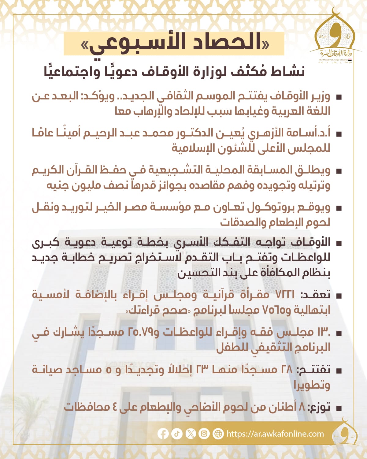 نشاط مُكثف لوزارة الأوقاف دعويًّا واجتماعيًّا.. الحصاد الأسبوعي
