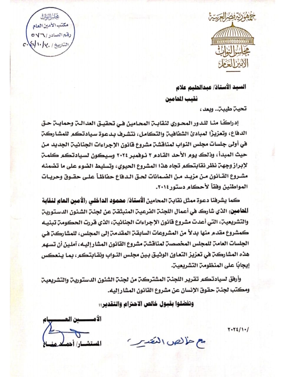 كما يشرفنا دعوة ممثل نقابة المحامين محمود الداخلي، الأمين العام لنقابة المحامين الذي شارك في أعمال اللجنة الفرعية المنبثقة عن لجنة الشئون الدستورية والتشريعية، التي أعدت مشروع قانون الإجراءات الجنائية، الذي قررت الحكومة تبنيه كمشروع مقدم منها بدلاً من المشروعات السابقة المقدمة إلى المجلس، للمشاركة في الجلسات العامة للمجلس المخصصة لمناقشة مشروع القانون المشار إليه، آملين أن تسهم هذه المشاركة في تعزيز التعاون الوثيق بين مجلس النواب ونقابتكم، بما ينعكس إيجابا على المنظومة التشريعية.