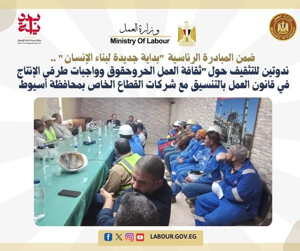 نظمت مديرية العمل بمحافظة أسيوط، ندوتين تثقيفيتين حول "ثقافة العمل الحر وتنمية مهارات وقدرات الشباب المهنية والإرشاد المهني" ، لتوعية العاملين ، وذلك بمقر "شركة البدر" بجحدم بمركز منفلوط، وذلك بحضور عدد 20 من العاملين بالشركة ، ومقر"شركة بتروجيت" بمركز منفلوط، بحضور عدد 35 من العاملين بالشركة ، تهدف الندوتين التثقيفيتين إلى رفع الوعي بأهمية تنمية الشباب لقدراتهم ومهاراتهم لتتواكب مع متطلبات سوق العمل المتسارعة، فضلاً عن التطرق إلى حقوق وواجبات العمال وأصحاب الأعمال في ضوء القانون رقم 12 لسنة 2003، وكذلك الضوابط والمحاذير التي نص عليها القانون.