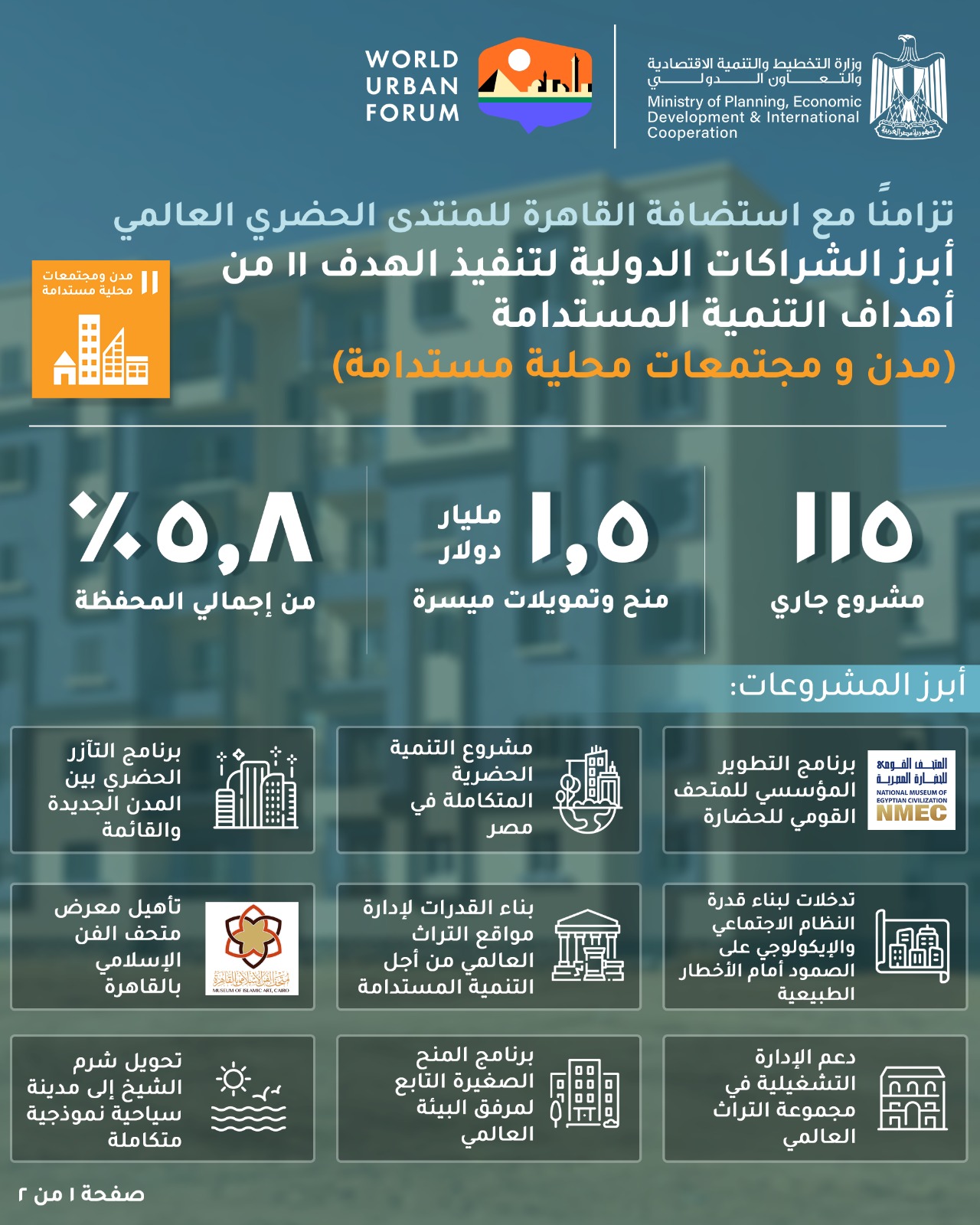 وأشارت إلى أبرز المشروعات الجارية لتنفيذ هذا الهدف، مثل برنامج التطوير المؤسسي للمتحف القومي للحضارة، ومشروع التدخلات لبناء قدرة النظام الاجتماعي والإيكولوجي على الصمود أمام الأخطار الطبيعية بالشراكة مع منظمة اليونسكو، ومشروع التنمية الحضرية المتكاملة في مصر بالشراكة مع برنامج الأمم المتحدة للمستوطنات البشرية، وبرنامج التآزر الحضري بين المدن الجديدة والقائمة بالشراكة مع برنامج الأمم المتحدة الإنمائي.