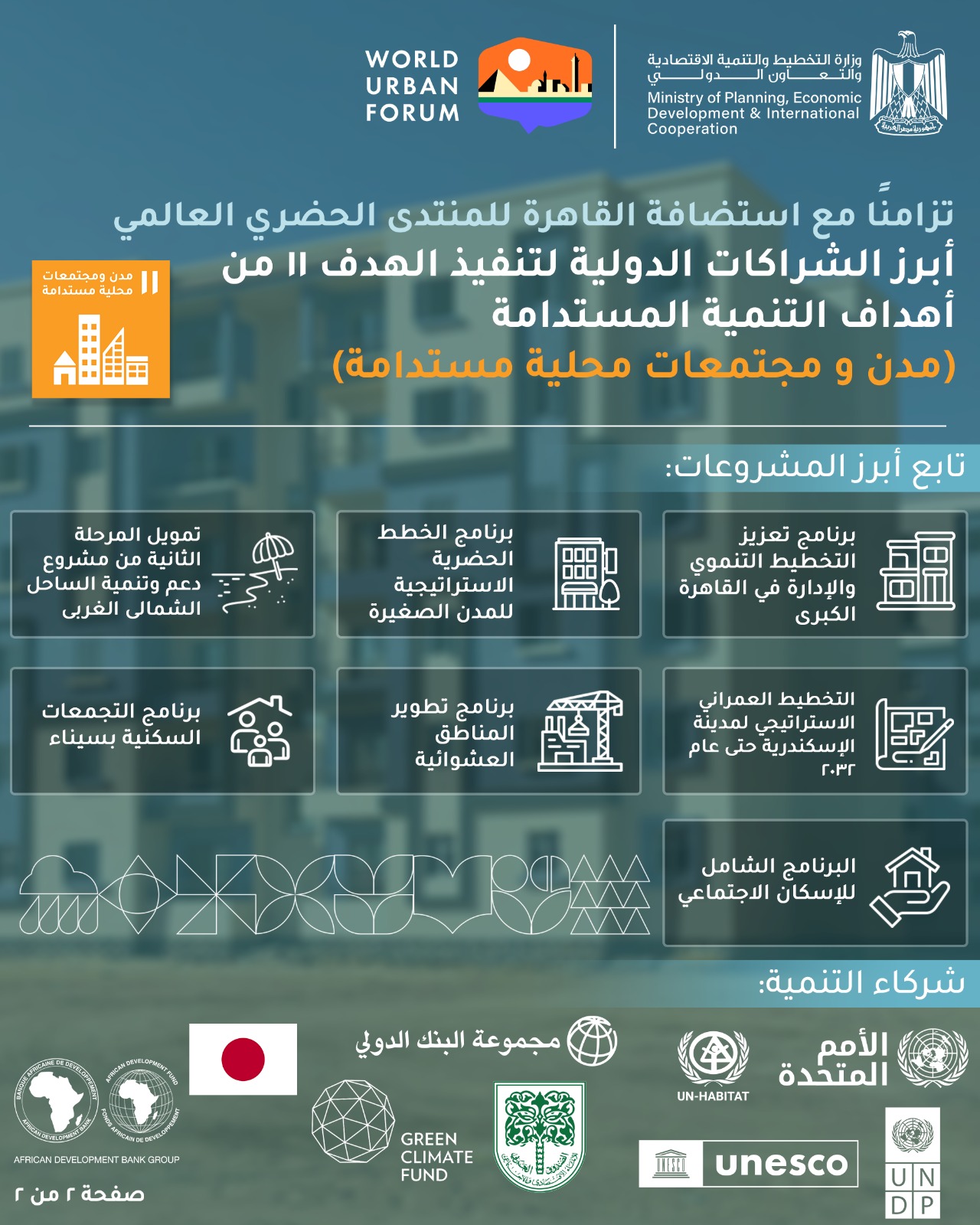 جدير بالذكر المنتدى الحضري العالمي، الذي ينعقد تحت شعار «كل شيء يبدأ محليا - لنعمل معا من أجل مدن ومجتمعات مستدامة»، تنظمه الحكومة المصرية بالتعاون مع برنامج الأمم المتحدة للمستوطنات البشرية "هابيتات"، ويناقش الدور الحاسم الذي يمكن أن يلعبه العمل المحلي في تسريع وتيرة التقدم نحو الاستدامة الحضرية، والموضوعات ذات الصلة بالتحضر والمدن الذكية والمستدامة، لاسيما ما يتعلق بتعزيز التوسع الحضري الشامل للجميع والمستدام، والقدرة على تخطيط وإدارة المستوطنات البشرية في جميع البلدان على نحو قائم على المشاركة ومتكامل ومستدام، بحلول عام 2030 وهو ما نص عليه الهدف الحادى عشر من أهداف التنمية المستدامة 2030.