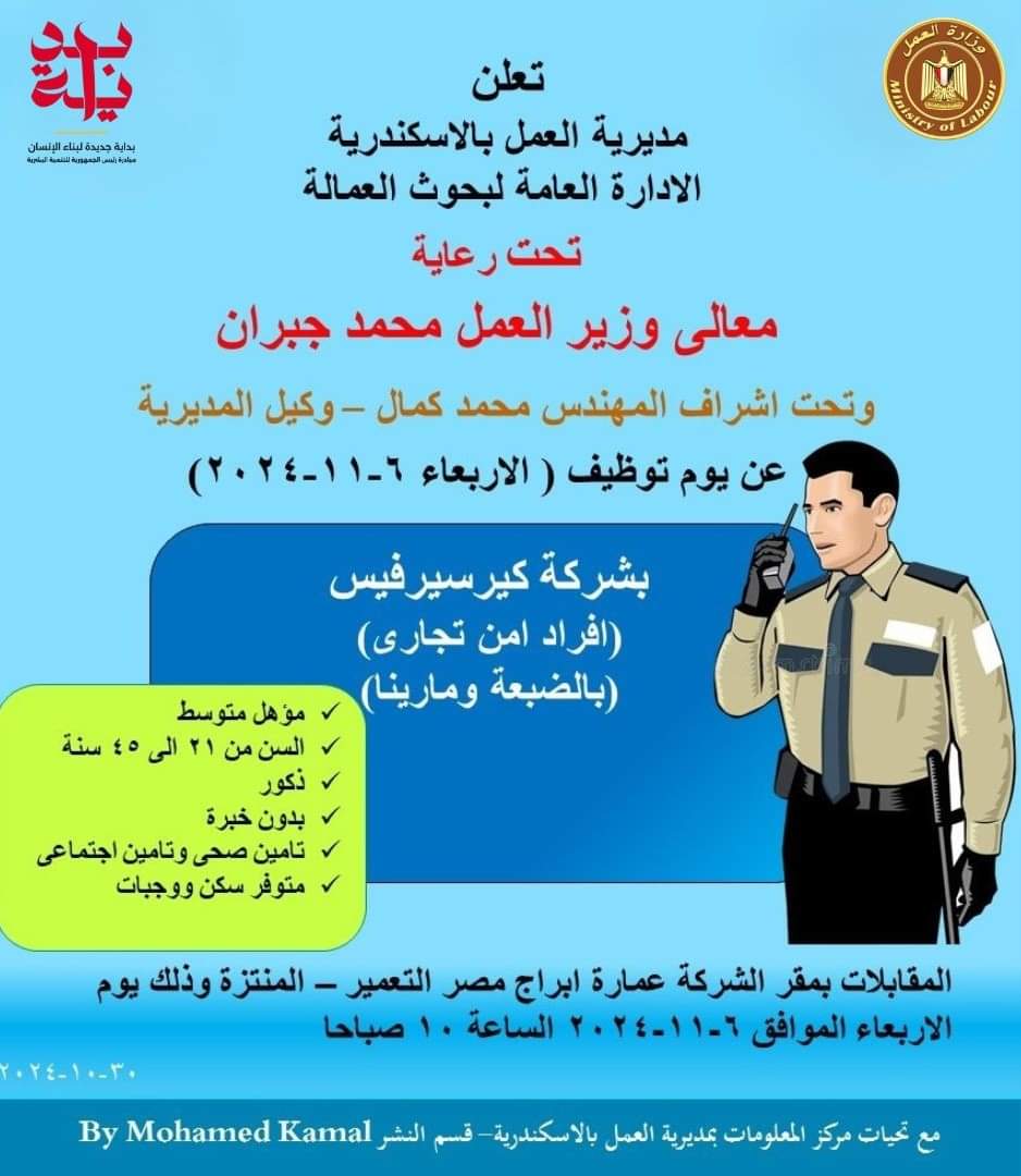 أعلنت مديرية العمل بمحافظة الأسكندرية، عن تنظيم يوم توظيفي لتوفير 150 فرصة عمل جديدة للشباب ، وذلك للعمل بشركة كير سيرفس بوظيفة "امن تجاري" بالساحل الشمالي ( مارينا – والضبعة ) ، وفرتها الإدارة العامة لبحوث العمالة بالتنسيق مع الشركة ، وفتح باب التقديم للراغبين فى الحصول على تلك الفرص من يوم الأربعاء الموافق 6 – 11 – 2024 ، بمقر الشركة وعنوانه : عمارة ابراج مصر للتعمير المنتزة من الساعة ١٠ صباحاً ، ومن مزايا تلك الفرص : توفير إقامة بالموقع للمغتربين ، ووجبات ، وتأمين اجتماعى وصحي.
