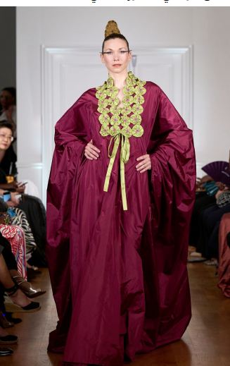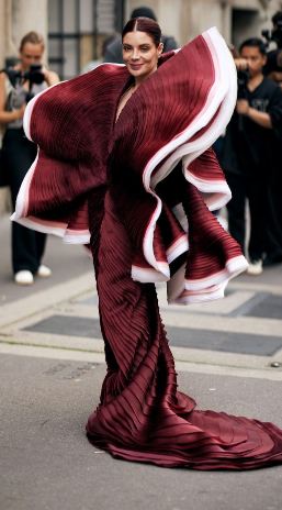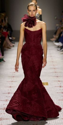 وقدم المبدع العالمي إيلي صعب من اللون البرغندي فستاناً بالطراز الإسباني المصمم من الساتان الحريري بطابع Capitonne مدروز بشكل متموج ويتسم بقصة حورية فهو خالٍ من الأكمام وينحدر بقصة ضيقة لتتسع تحت الركبتين، وقد تم تنسيق وردة من الأورغنزا أحاطت بعنق العارضة لتضفي طابع فنتدج يعود إلى مطلع القرن العشرين.