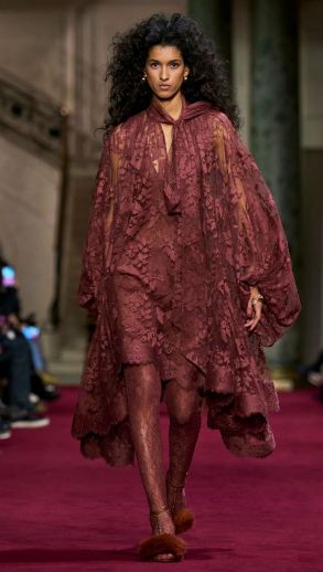 اختاري فستاناً واسعاً من الدانتيل الفرنسي من زيمرمان Zimmermann، يزدان بياقة مقفولة وأكمام طويلة شفافة على قاعدة مبطنة بقماش نيود ويتسم بطابع أوفرسايز وهو تصميم يليق بكل أشكال الأجسام، ويمكنك تنسيقه مع جوارب مخرمة من الدنتيل مع حذاء من الفرو العسلي المائل إلى البني بكعب عالٍ. وتعتبر هذه الإطلالة ضمن طابع البوهو شيك وهي مثالية للمناسبات ولإخفاء مشاكل البطن والأرداف.