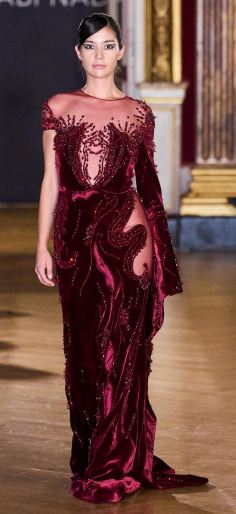 قدم المصمم روبير أبي نادر مجموعة متنوعة لخريف شتاء 2024-2025 فستانا طويلًا مجسمًا صمم من قماش التل مع المخمل المطرز بخرز بلون البرغندي مع أحجار لامعة ويتداخل معه الموسلين الشفاف عند الصدر ويتسم بقصة مستقيمة مريحة وبأكمام غير متجانسة، وهو مثالي لحضور مناسبات الأعراس.