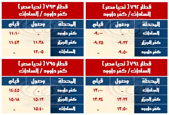 • تشغيل قطار 793 كفر داوود / السادات حيث يقوم من محطة كفر داوود الساعة 11:10 يصل محطة السادات الساعة 12:05 بتركيب ( 5 عربات تحيا مصر ) كالجدول المرفق .