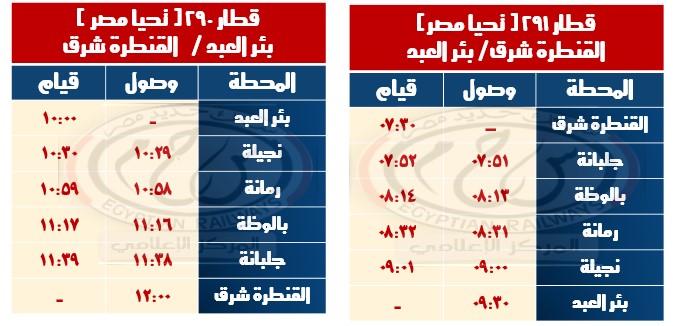 • تشغيل قطار 291 يقوم من محطة القنطرة شرق الساعة 07:30 يصل محطة بئر العبد الساعة 09:30 بتركيب ( 4 عربات تحيا مصر ) كالجدول المرفق .