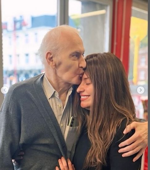 وظهرت نرمين الفقي وكأنها طفله تعانق والدها ومعتزه بوجوده بجانبها بحب وود ورحمة، لتؤكد للجميع انها مازالت طفلته المدلالة التي تعيش في حالة من الرومانسية والعز في أحضانه الدائمة.