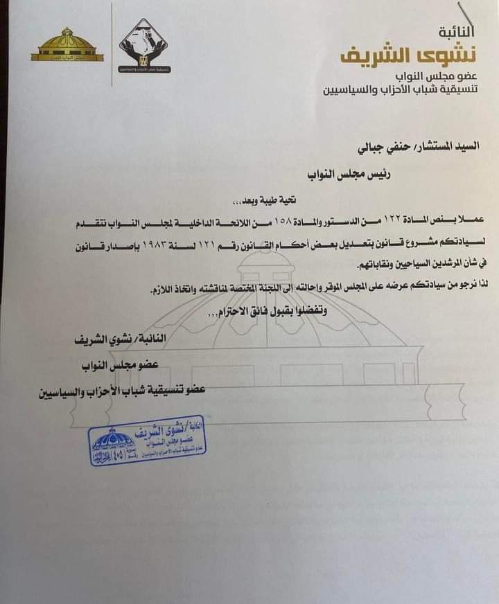 أحال المستشار الدكتور حنفي جبالي، رئيس مجلس النواب، مشروع قانون مُقدم من نائبة التنسيقية نشوى الشريف، و (أكثر من عُشر عدد أعضاء المجلس) بتعديل بعض أحكام قانون المرشدين السياحيين ونقابتهم الصادر بالقانون رقم 121 لسنة 1983 إلى لجنة مشتركة من لجان السياحة والطيران المدني، الشئون الدستورية والتشريعية، القوى العاملة، والخطة والموازنة .