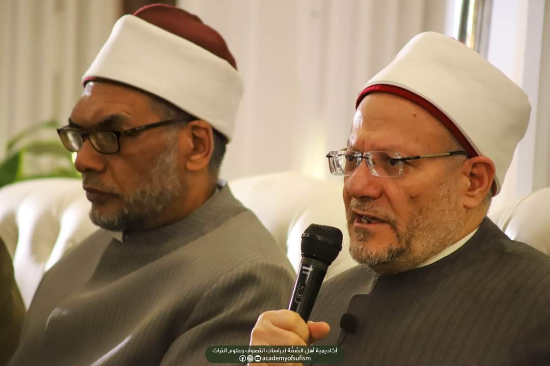 وقدم الدكتور شوقي علام – مفتي الديار المصرية الأسبق الشكر للبيت المحمدي والإمام الرائد الشيخ محمد زكي الدين إبراهيم رحمه الله، والدكتور محمد مهنا أستاذ الشريعة والقانون بجامعة الأزهر الذي يصل الحاضر بالماضي في إحياء التصوف، مؤكدًا أن هذه الأكاديمية موافقة للدعوة الكريمة من السيد الرئيس عبد الفتاح السيسي والدولة المصرية لمبادرة بناء الإنسان، التي جاءت في موطنها الصحيح، لأن البداية لابد أن تكون من بناء الإنسان. وبناء الإنسان استغرق زمنًا طويلا من سيدنا رسول الله صلى الله عليه وسلم في مكة المكرمة متبوعة هذه المرحلة بالمدينة المنورة، هذه البداية تكون بتربية وتنمية الضمير وغرس القيم وتحقيق الرقابة الذاتية للإنسان وهو لا يكون إلا بعمار كامل للقلوب. ولهذا فإن القلب احتل مساحة كبيرة في النص الشرعي من حيث وجوده وتحقيقه على نحو كامل، فهذا الوازع هو الذي ينبغي أن نركز عليه. وفي تقديري أن هذه الدراسة ما بين الأحكام الشرعية والأحكام القلبية هي الأساس الذي ينطلق منه المجتمع. تهذيب النفس، الأخلاق، القيم، التصوف . فإذا تحققنا من ذلك فإننا نكون أمام بناء صحيح للإنسان لا يحتاج إلى رقابة من الخارج إنما يحتاج إلى ضمير داخلي يرى، ويحتاج إلى قلب مستنير بنور الله تعالي ينطلق إلى الإعمار وإلى أداء دوره كخليفة عن الله سبحانه وتعالى.