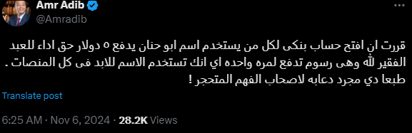 ونشر أديب منشور خلال الساعات الماضية عبر صفحته الرسمية بموقع إكس قائلًا:" قررت فتح حساب بنكي لكل من يستخدم اسم أبو حنان يدفع 5 دولارات حق أداء للعبد الفقير لله، وهي رسوم تدفع لمرة واحدة أي إنك تستخدم الاسم للأبد في كل المنصات، واستدرك قائلا: "طبعا دي مجرد دعابة لأصحاب الفهم المتحجر!".