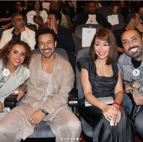 وبدت منة شلبي بإطلالة جذابة، مرتديه جمبسوت بكشكاش من الأمام صمم من قماش اللاميه باللون الأسود.