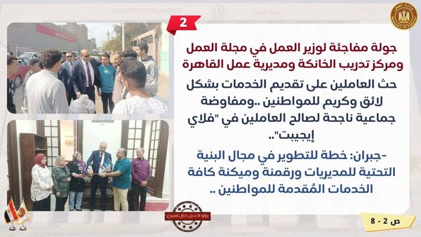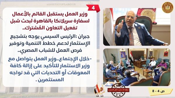 وقام وزير العمل السيد / محمد جبران بجولة مفاجئة شملت مجلة العمل ،ومركز تدريب الخانكة ،ومديرية عمل القاهرة ،وعقد إجتماعًا مع العاملين بمديرية العمل،وشهد مفاوضة جماعية ناجحة لصالح العاملين بشركة الطيران "فلاي إيجيبت".. كما التقى وزير العمل ، بديوان عام الوزارة ، مع عددِ من مُمثلي شركات إلحاق العمالة بالخارج ،للوقوف على أخر التطورات بشأن الترتيبات والإجراءات الخاصة بعمل العِمالة المصرية الموسمية لموسم الحج للعام القادم "2025"..و إستقبل وزير العمل، بمقر "الوزارة" بالعاصمة الإدارية الجديدة ،القائم بالأعمال لسفارة سريلانكا بالقاهرة وعددِ من المستثمرين السيرلانكيين،لبحث تفعيل سُبل التعاون المُشترك ،كما إستقبل وزير العمل ، بمقر "الوزارة" سفير بلغاريا بالقاهرة السيد/ ديان كاتراتشيف لبحث سُبل تفعيل التعاون في المجالات المُشتركة ..