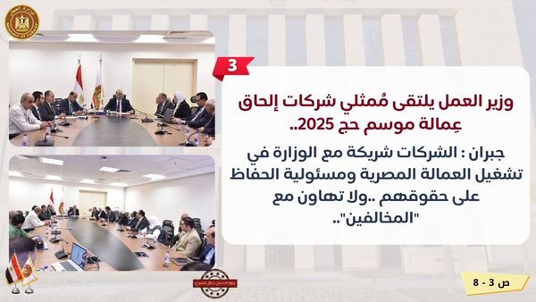 وخلال الأسبوع شارك وزير العمل في المؤتمر الدولي السابع " ضمان جودة التعليم في عصر الذكاء الاصطناعي"،الذي نظمته الهيئة القومية لضمان جودة التعليم والاعتماد ، والمنعقد في القاهرة ...كما دعا وزير العمل السيد/ محمد جبران، العمال المصريين في المملكة الأردنية الهاشمية ،بالإلتزام بالقرارات والإجراءات التنظيمية الجديدة الصادرة عن وزارة العمل الأردنية ،التي تتعلق بتنظيم سوق العمل الأردني.. وتواصل مديريات العمل في المحافظات تنفيذ توجيهات الوزير جبران، بالاستمرار في تنفيذ أهداف المبادرة الرئاسية "بداية جديدة لبناء الإنسان" وذلك من خلال نشر ثقافة السلامة والصحة المهنية في مواقع العمل والإنتاج ،وكذلك تكثيف الجهود في مراكز التدريب المهني لتنمية مهارات الشباب على مهن المستقبل ،في اطار خطة الوزارة "التدريب من أجل التشغيل"..وتقديم الخدمات للمواطنين بشكل لائق وكريم ..إلى "الانفوجراف"..