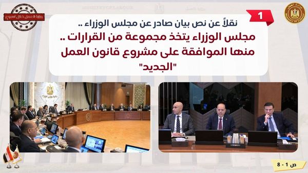 أصدرت وزارة العمل اليوم الجمعة فيديو  و"إنفوجراف " بشأن نشاط الوزارة خلال الـ 7 أيام الماضية.. انتهى الأسبوع بقرارات من مجلس الوزراء من بينها الموافقة على مشروع قانون العمل "الجديد"، وذلك في اجتماع بحضور وزير العمل محمد جبران ، مع الأخذ في الاعتبار إدراج الملاحظات التي أبداها عدد من الوزراء في الاجتماع، بما يسهم في سرعة إعداده في صورته النهائية، وإرساله إلى البرلمان.