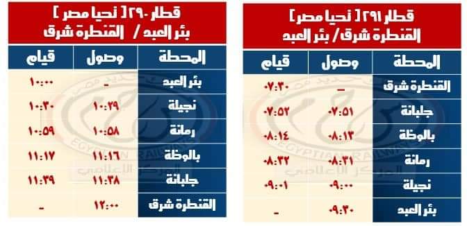• تشغيل قطار 290 يقوم من محطة بئر العبد الساعة 10:00 يصل محطة القنطرة شرق الساعة 12:00  بتركيب ( 4 عربات تحيا مصر ) كالجدول المرفق .