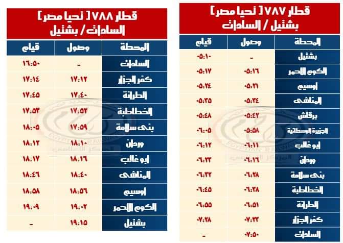 • تشغيل قطار 788 السادات / بشتيل حيث يقوم من محطة السادات الساعة 16:50 يصل محطة بشتيل الساعة 19:15 بتركيب ( 5 عربات تحيا مصر  ) كالجدول المرفق .