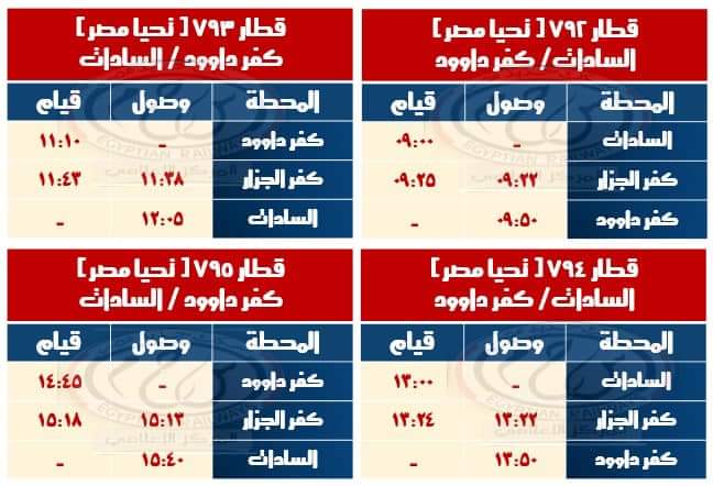 • تشغيل قطار 795 كفر داوود  / السادات حيث يقوم من محطة كفر داوود الساعة 14:45  ويصل محطة السادات الساعة 15:40 بتركيب ( 5 عربات تحيا مصر  ) كالجدول المرفق .