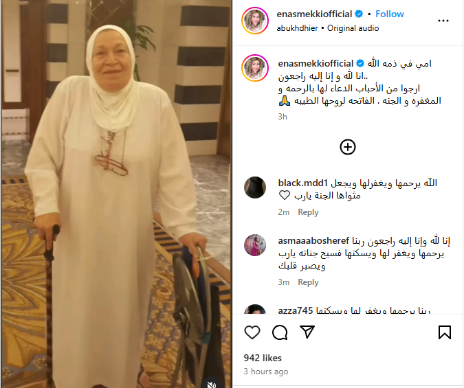 وعلقت مكي على الصور قائلة: أمي في ذمة الله.. إنا لله وإنا إليه راجعون، أرجو من الأحباب الدعاء لها بالرحمة والمغفرة والجنة.. الفاتحة لروحها الطيبة.