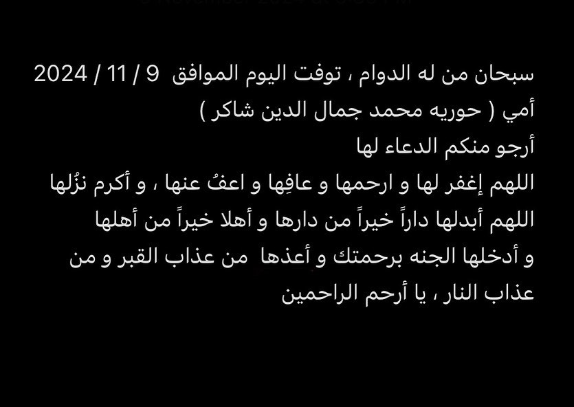 وكتب مكي، “أرجو منكم الدعاء لها اللهم اغفر لها وارحمها وعافها واعفُ عنها، وأكرم نزلها اللهم أبدلها دارًا خيرًا من دارها وأهلا خيرًا من أهلها وأدخلها الجنة برحمتك وأعذها من عذاب القبر ومن عذاب النار، يا أرحم الراحمين”.