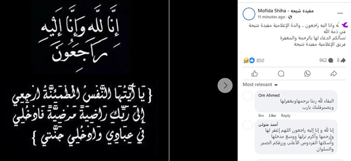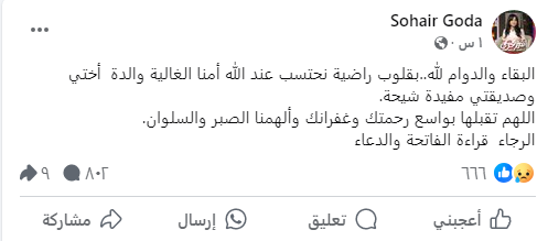 ونعت الإعلامية سهير جودة والدة صديقتها قائلة: «البقاء والدوام لله.. بقلوب راضية نحتسب عند الله أمنا الغالية والدة أختي وصديقتي مفيدة شيحة، اللهم تقبلها بواسع رحمتك وغفرانك وألهمنا الصبر والسلوان، الرجاء قراءة الفاتحة والدعاء».