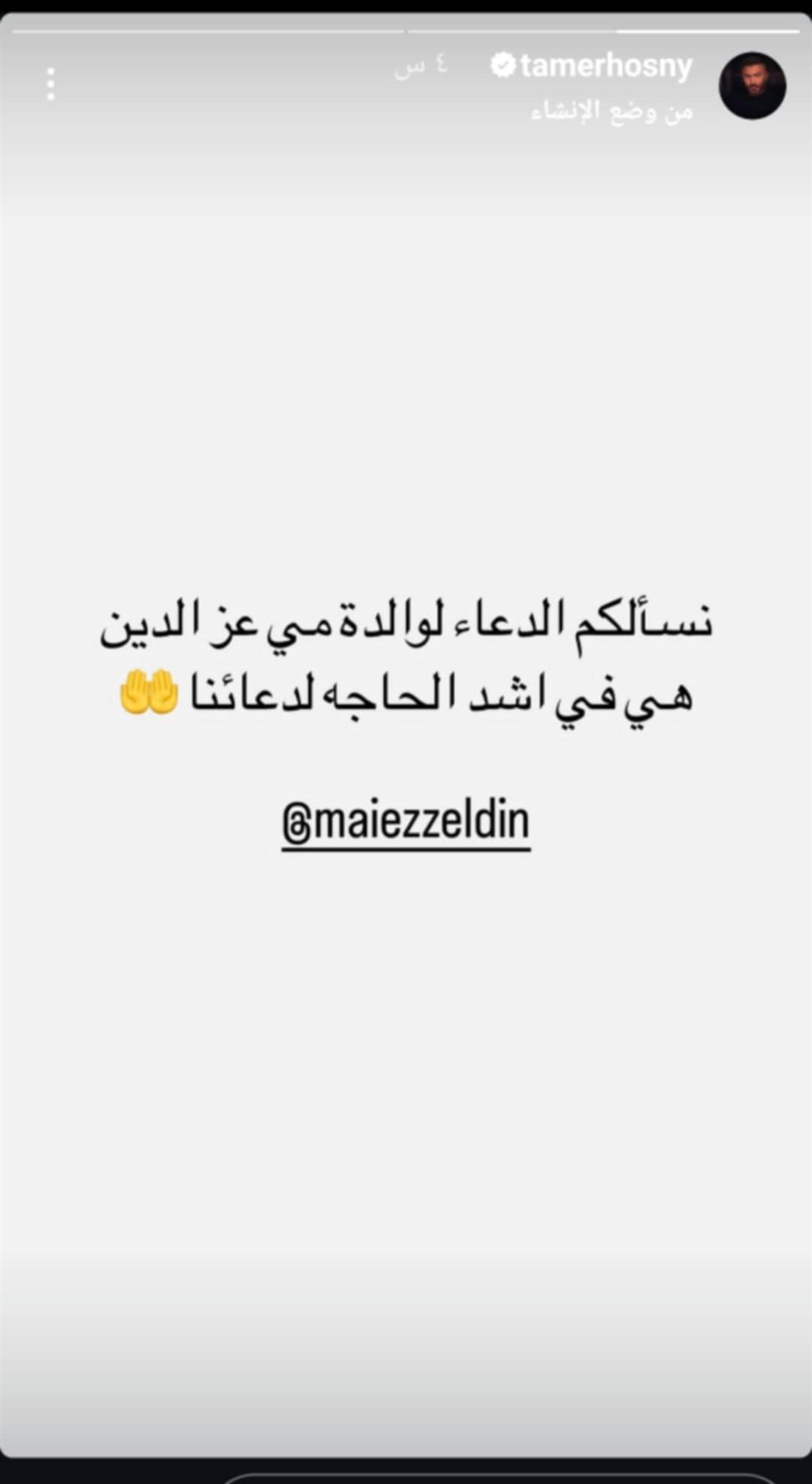 طالب النجم تامر حسني من جمهوره الدعاء لوالدة صديقته الفنانة مي عز الدين وذلك عبر خاصية القصص المصغرة على حسابه الرسمي على موقع تبادل الصور والفيديوهات الأشهر انستجرام .
