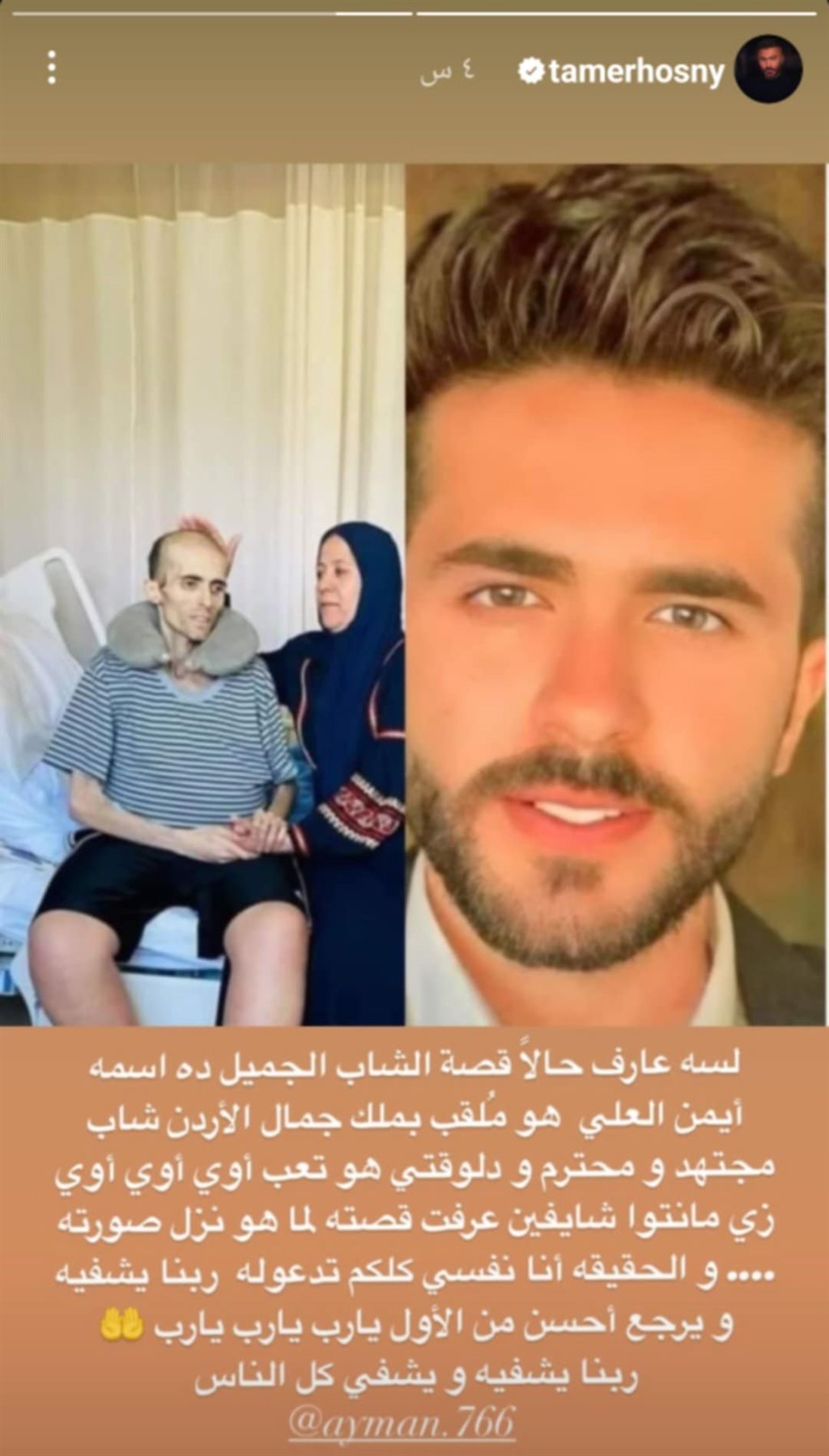 وكتب تامر حسني: “لسة عارف حالًا قصة الشاب الجميل، ده اسمه ”أيمن العلي" هو ملقب بملك جمال الأردن، شاب مجتهد ومحترم، ودلوقتي هو تعب أوي أوي أوي زي مانتوا شايفين".
