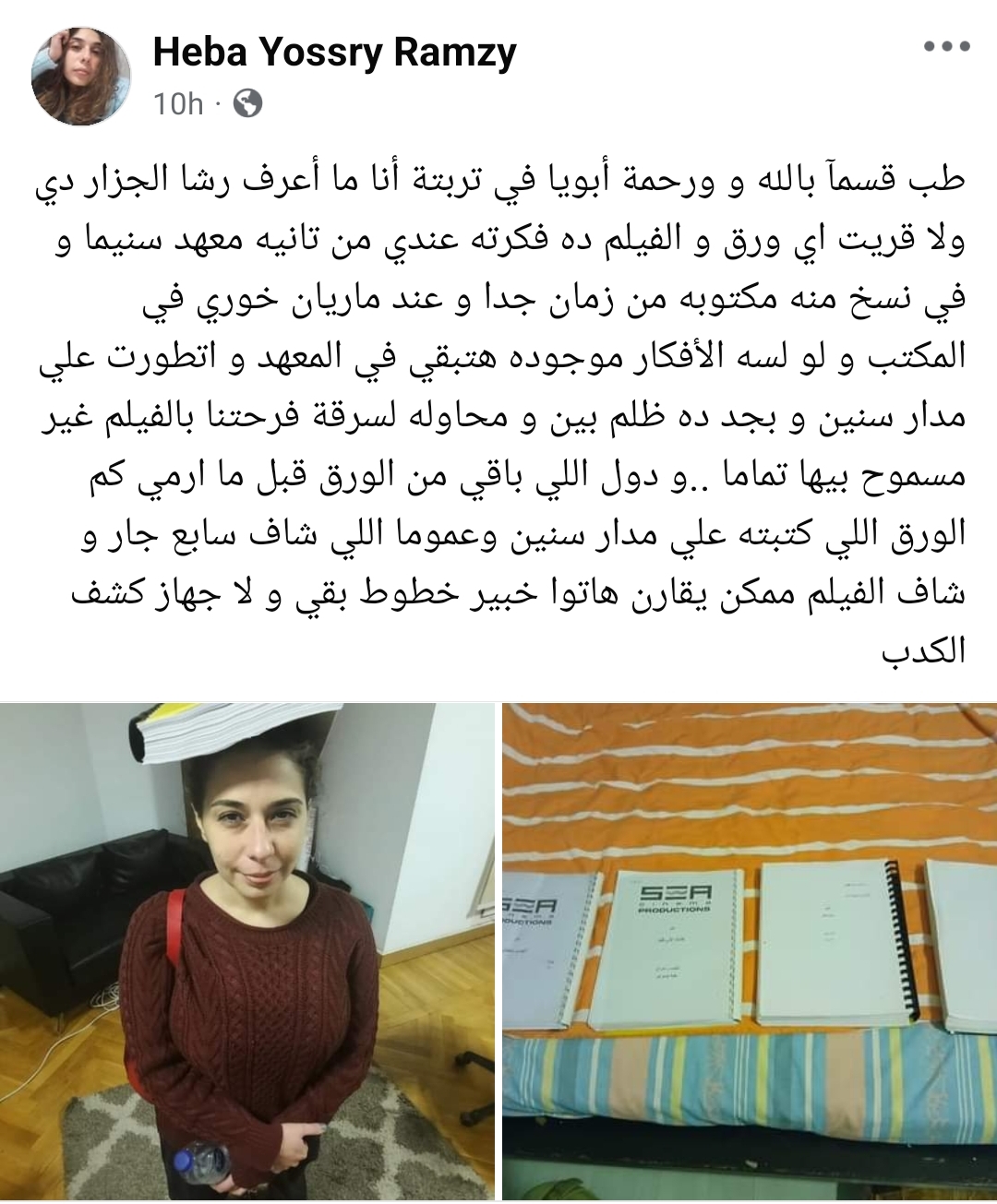 وكتبت هبه يسري، عبر صفحتها قائلة: "طب قسمًا بالله ورحمة أبويا في تربته أنا ما أعرف رشا الجزار دي ولا قريت أي ورق والفيلم ده فكرته عندي من تانيه معهد سينما وفي نسخ منه مكتوبة من زمان جدًا وعند ماريان خوري في المكتب".