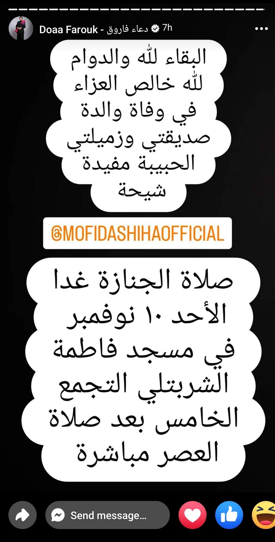 وكتبت دعاء فاروق، عبر خاصية الإستوري، قائلة: "صلاة الجنازة اليوم الأحد الموافق 10 نوفمبر في مسجد فاطمة الشربتلي بالتجمع الخامس بعد صلاة العصر مباشرة".