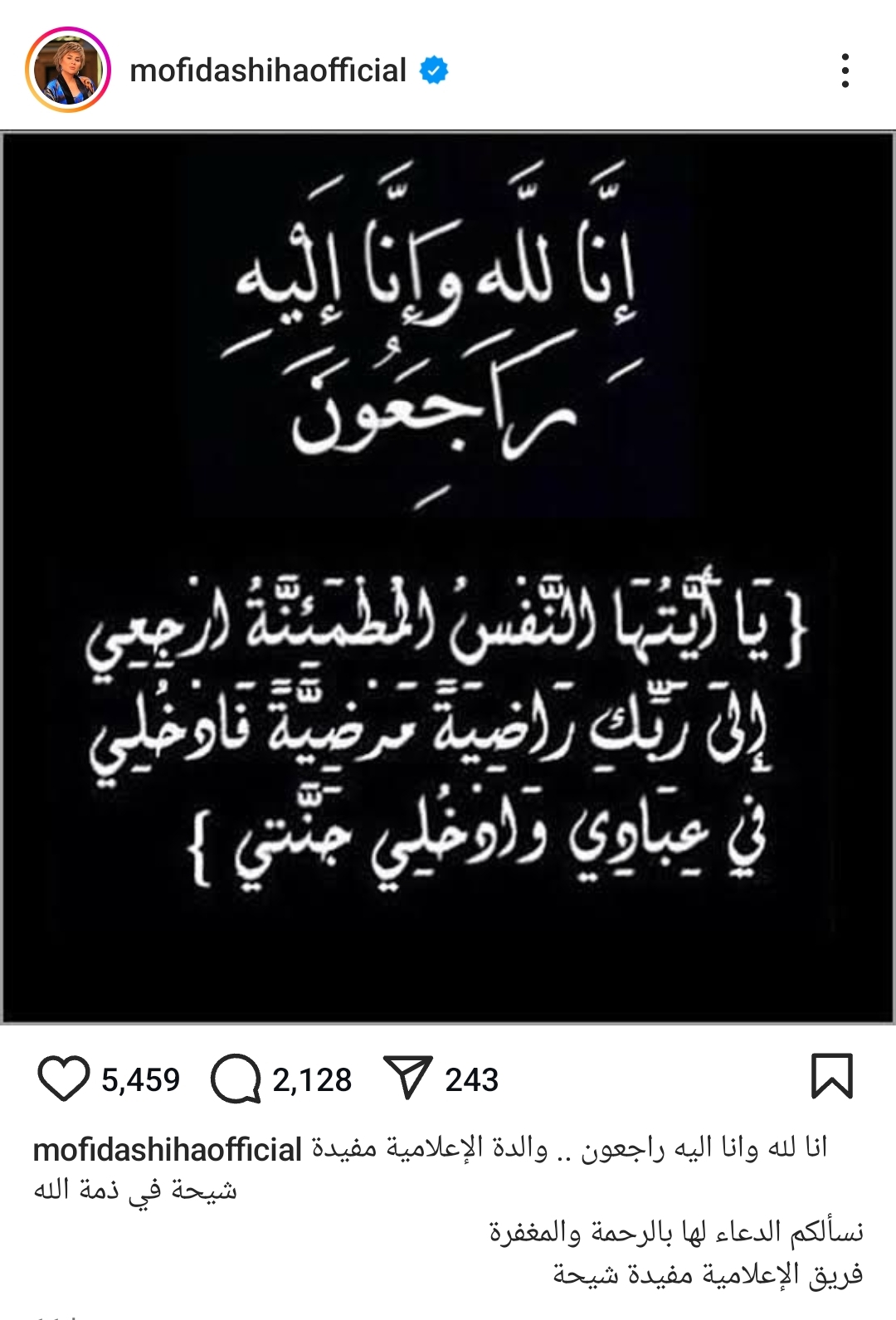 وكتبت الصفحة: "إنا لله وإنا إليه راجعون.. والدة الإعلامية مفيدة شيحة في ذمة الله.. نسألكم الدعاء لها بالرحمة والمغفرة".