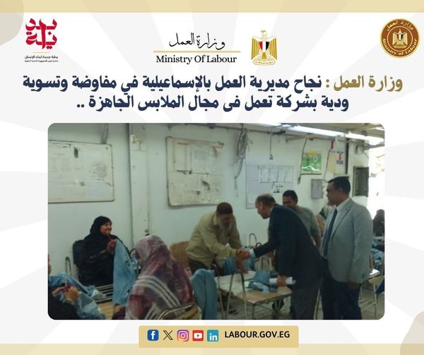 أعلنت مديرية العمل بمحافظة الإسماعيلية عن نجاح عمليات مفاوضة وتسوية ودية بين مسئولي شركة فيرتيكال جينز بالمنطقة الصناعية الأولى، والتى يبلغ عدد العاملين بها أكثر من 750 عاملا.