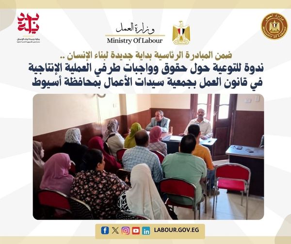 نظمت مديرية العمل بمحافظة أسيوط، ندوة للتوعية حول حقوق وواجبات طرفي العملية الإنتاجية، العمال وأصحاب الأعمال في ضوء القانون رقم 12 لسنة 2003 ، وذلك لتوعية العاملين بمقر "جمعية سيدات الأعمال" بديروط، بحضور عدد 25 من العاملين بالجمعية.