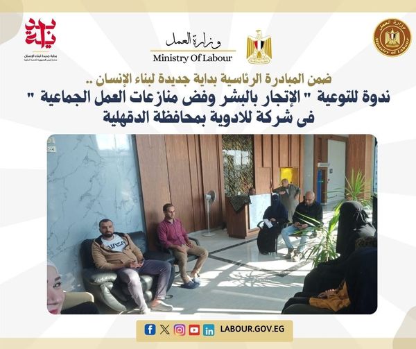 وقال أحمد رجائى وكيل مديرية العمل بالدقهلية ، إن تلك الجهود تأتي تنفيذاً لتوجيهات وزير العمل محمد جبران ، لمديريات العمل بالمحافظات ، بتكثيف الجهود ،والتعاون مع كافة الوزارات ،والجهات المعنية ، لُسرعة تحقيق أهداف المبادرة الرئاسية "بداية جديدة لبناء الإنسان"،التي أطلقها رئيس مجلس الوزراء د. مصطفى مدبولي ، لتحسين جودة الحياة لجميع المواطنين في مختلف أنحاء الجمهورية ، وتقديم الخدمات الحكومية في مجالات: التعليم، والصحة، والثقافة، والرياضة، والتوظيف، بطريقة تكاملية بين مختلف الجهات المشاركة، وتنظيم ندوات توعوية حول أحكام قانون العمل وحقوق العمال وواجباتهم بهدف تعزيز علاقات العمل بين طرفى العملية الإنتاجية.