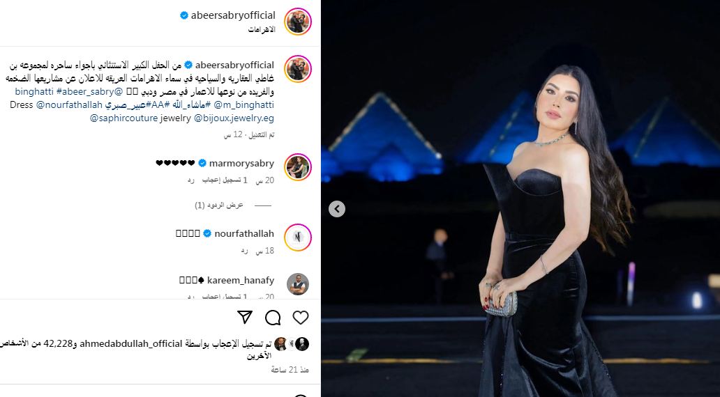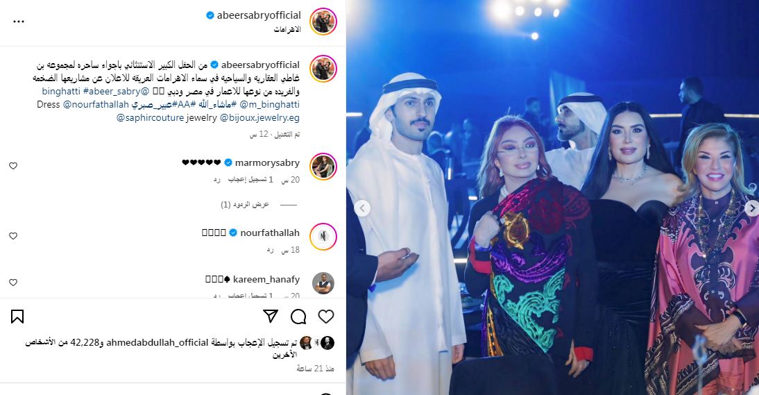وعلقت على الصور، قائلة: "من الحفل الكبير الاستنثائي باجواء ساحره لمجموعه بن غاطي العقاريه والسياحيه في سماء الأهرامات العريقه للإعلان عن مشاريعها الضخمه والفريده من نوعها للإعمار في مصر ودبي".