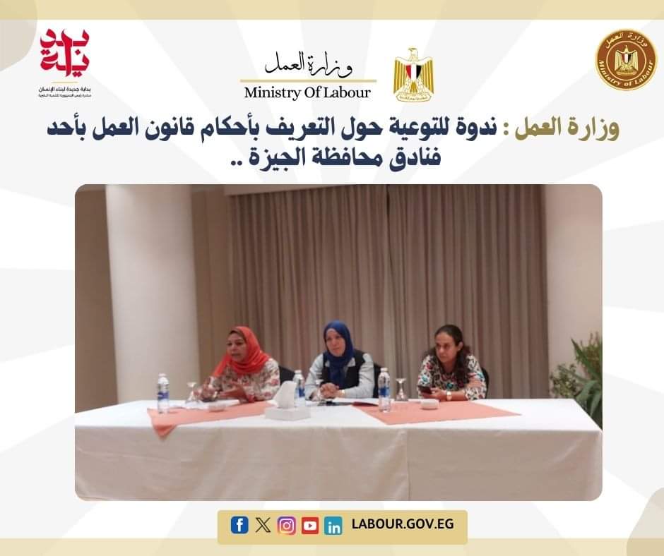 وزارة العمل تنظم ندوة للتوعية حول التعريف بأحكام القانون بأحد فنادق الجيزة