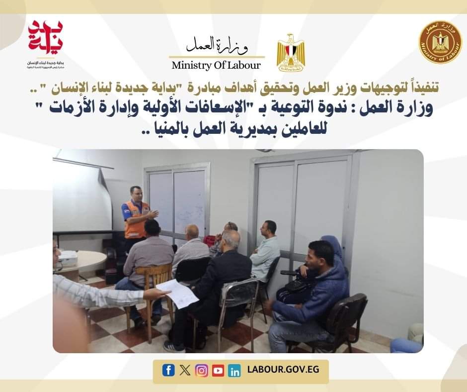 وزارة العمل تنظم ندوة "الإسعافات الأولية وإدارة الأزمات" للعاملين بالمنيا