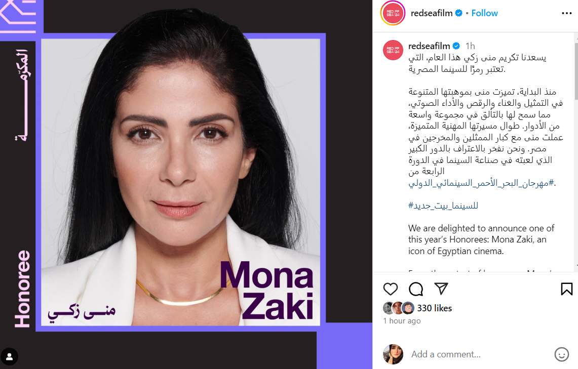 وأضافت عن نجاحات منى زكي: "طوال مسيرتها المهنية المتميزة، عملت منى مع كبار الممثلين والمخرجين في مصر. ونحن نفخر بالاعتراف بالدور الكبير الذي لعبته في صناعة السينما في الدورة الرابعة من مهرجان البحر الأحمر السينمائي الدولي".