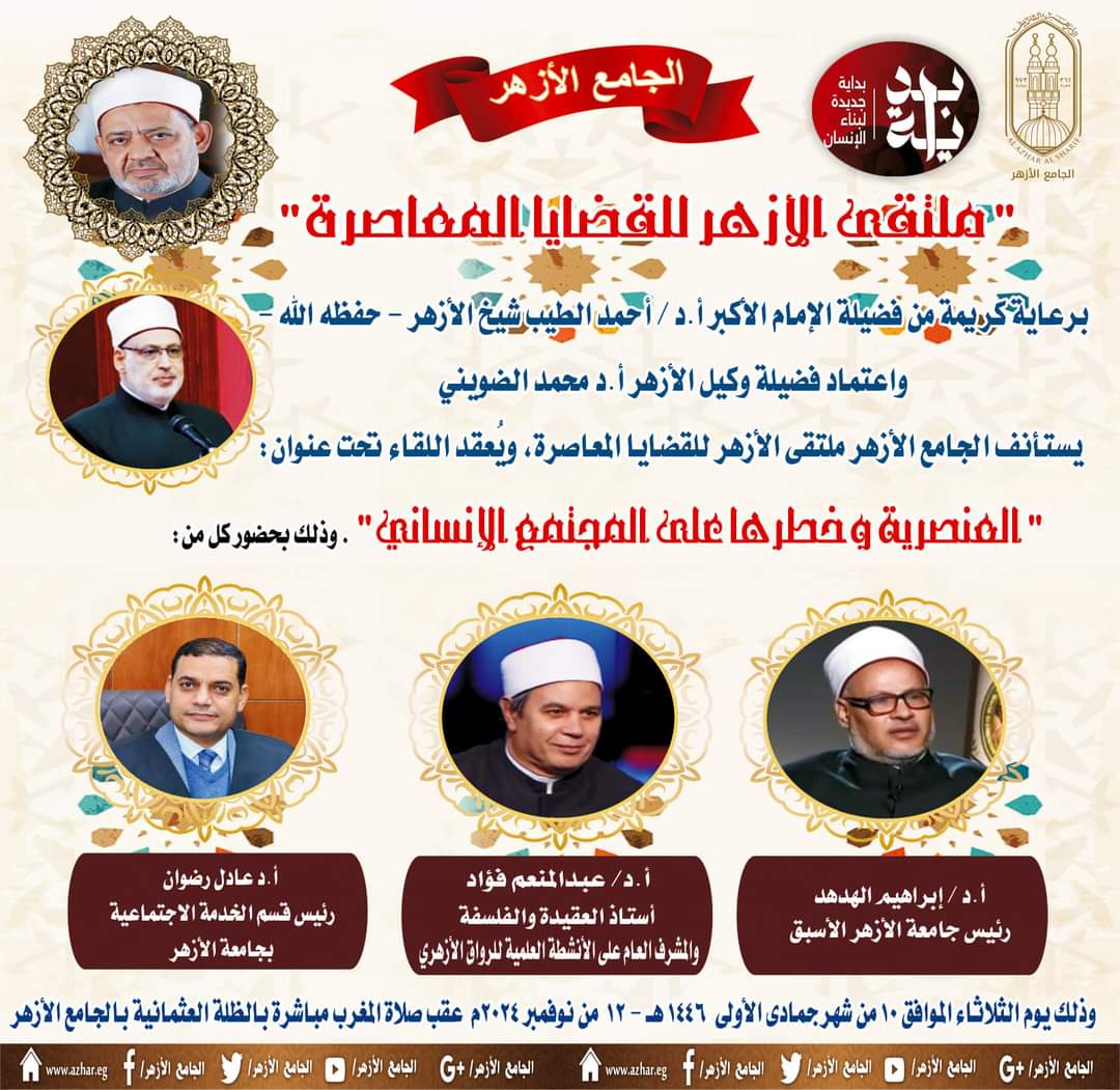 جدير بالذكر أن ملتقى "الأزهر للقضايا المعاصرة" يُعقد الثلاثاء من كل أسبوع في رحاب الجامع الأزهر الشريف، تحت رعاية الإمام الأكبر وبتوجيهات من الدكتور محمد الضويني وكيل الأزهر الشريف، حيث كان بمسمى "شبهات وردود" وتم تغييره لملتقى الأزهر للقضايا المعاصرة، بعد نجاحه طوال شهر رمضان والذي كان يعقد يوميًا عقب صلاة التراويح، ويتناول هذا الملتقى في كل حلقة قضية تهم المجتمع والوطن، والعالَمَين العربي والإسلامي.