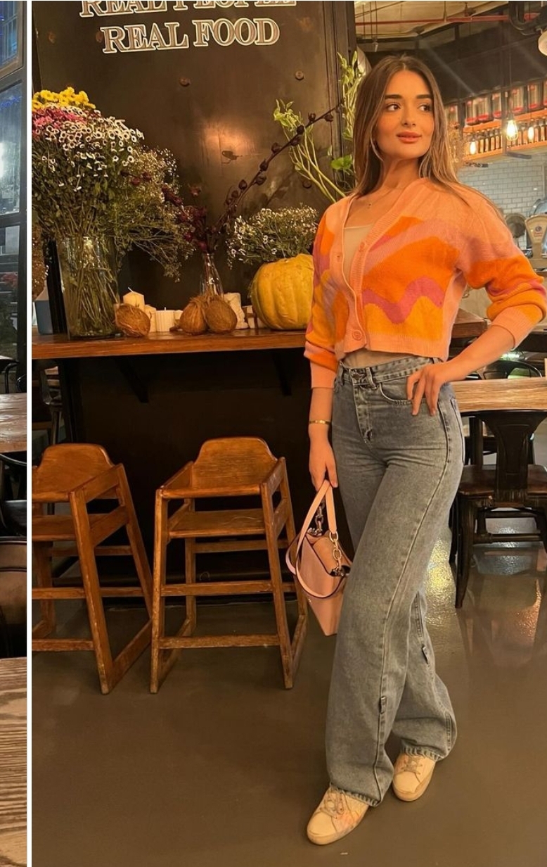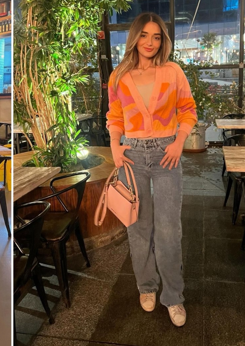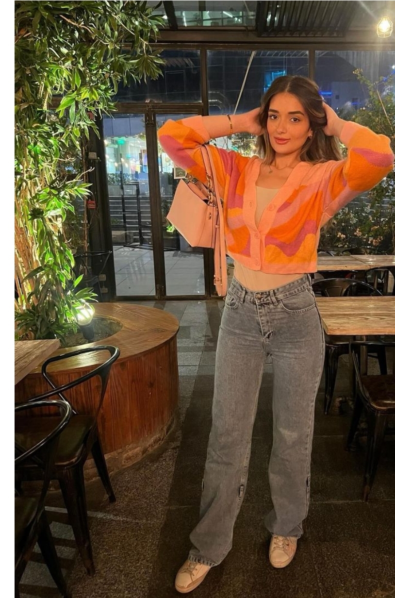 وبدت ملك أحمد زاهر بإطلالة كاجوال متناغمة مع ذوقها الراقي وأجواء الشتاء، مرتدية بلوفر ينتمي لقصة الأوفر سايز صمم من خيوط التريكو باللون البرتقالي ونسقت عليه بنطال جينز ينتمي لقصة الأوفر سايز فيما انتعلت حذاء رياضي باللون الابيض.