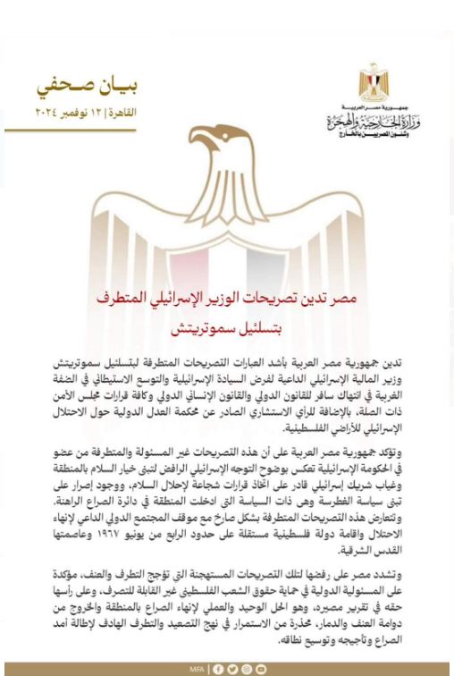 تدين مصر بأشد العبارات التصريحات المتطرفة لبتسلئيل سموتريتش، وزير المالية الإسرائيلي، الداعية لفرض السيادة الإسرائيلية والتوسع الاستيطاني في الضفة الغربية في انتهاك سافر للقانون الدولي والقانون الإنساني الدولي وكافة قرارات مجلس الأمن ذات الصلة، بالإضافة للرأي الاستشاري الصادر عن محكمة العدل الدولية حول الاحتلال الإسرائيلي للأراضي الفلسطينية.